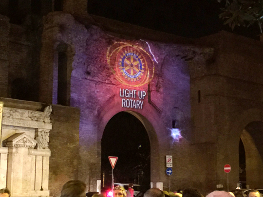 La sera, intorno alle h. 19.00, si è svolto un evento coreografico a Porta Pinciana. In una serata mite, in un clima festoso, sono state proiettate sulle Mura Aureliane immagini promozionali dell’attività rotariana.